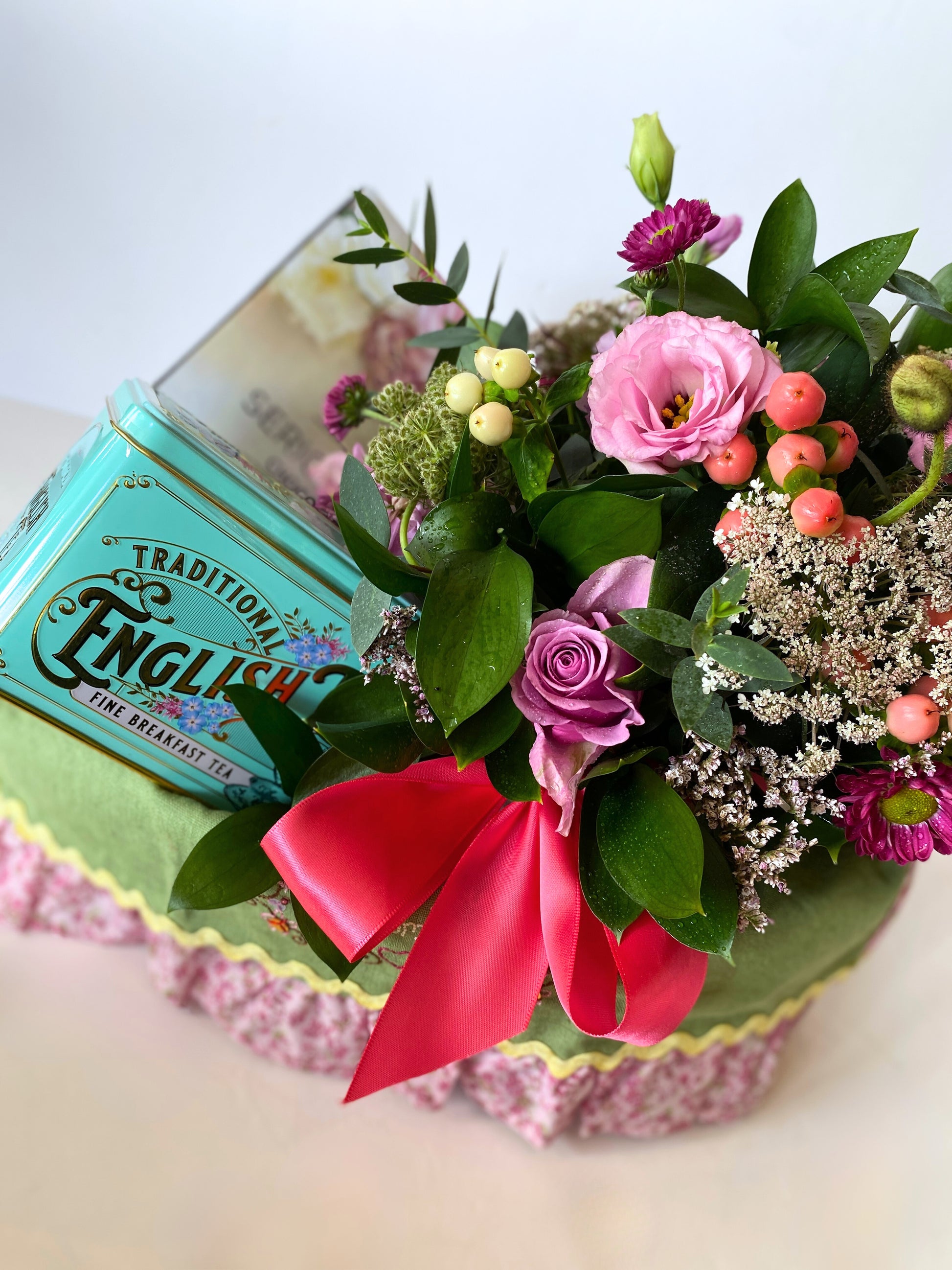 Also tucked inside is a Mother’s Day tea towel, adorned with a lovely design that adds a charming touch to her kitchen, and a seasonal posy in a white ceramic pot — a cheerful floral arrangement that brings a fresh burst of colour and fragrance to her space.